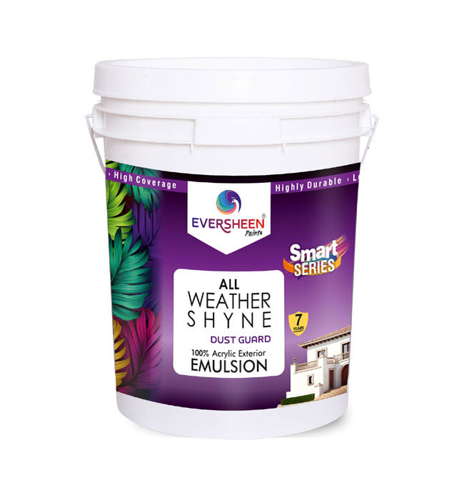 All Weather Shyne Acrylic `Emulsion is an elastomeric, super protective 100% acrylic Exterior Emulsion paint. Specially formulated for exterior walls and to provide shining look. It is water resistant and protects the exterior walls from dampness, algae and fungal caused by lashing rain. The elasticity of the paint film helps to bridge hairline micro cracks and also enhance the look of the walls.
